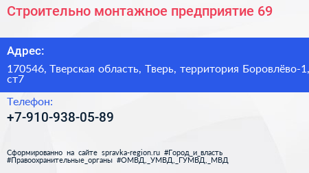 Строительно-монтажное предприятие 69 по адресу 170546, Тверская область, Тверь, территория Боровлёво-1, ст7 в дальнейшем Организация, размещена в следующих категориях:
