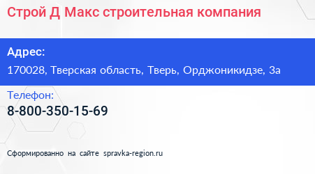 Строй Д-Макс, строительная компания по адресу 170028, Тверская область, Тверь, Орджоникидзе, 3а в дальнейшем Организация, размещена в следующих категориях: