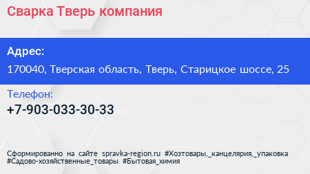 Сварка-Тверь, компания по адресу 170040, Тверская область, Тверь, Старицкое шоссе, 25 в дальнейшем Организация, размещена в следующих категориях: