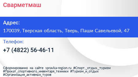 Сварметмаш по адресу 170039, Тверская область, Тверь, Паши Савельевой, 47 в дальнейшем Организация, размещена в следующих категориях: