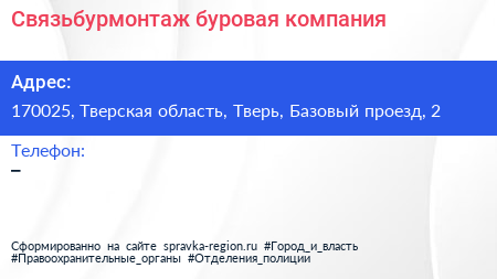 Связьбурмонтаж, буровая компания по адресу 170025, Тверская область, Тверь, Базовый проезд, 2 в дальнейшем Организация, размещена в следующих категориях: