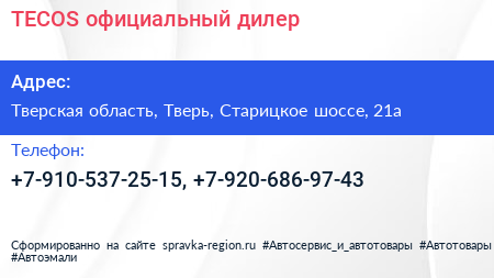 TECOS, официальный дилер по адресу Тверская область, Тверь, Старицкое шоссе, 21а в дальнейшем Организация, размещена в следующих категориях: