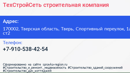 ТехСтройСеть, строительная компания по адресу 170002, Тверская область, Тверь, Спортивный переулок, 1а ст2 в дальнейшем Организация, размещена в следующих категориях: