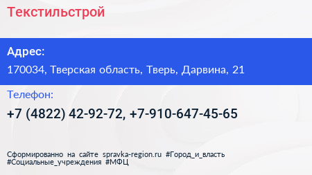 Текстильстрой по адресу 170034, Тверская область, Тверь, Дарвина, 21 в дальнейшем Организация, размещена в следующих категориях: