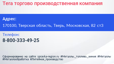 Tera, торгово-производственная компания по адресу 170100, Тверская область, Тверь, Московская, 82 ст3 в дальнейшем Организация, размещена в следующих категориях: