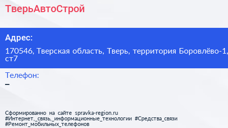 ТверьАвтоСтрой по адресу 170546, Тверская область, Тверь, территория Боровлёво-1, ст7 в дальнейшем Организация, размещена в следующих категориях: