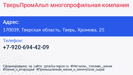 ТверьПромАльп, многопрофильная компания по адресу 170039, Тверская область, Тверь, Хромова, 25 в дальнейшем Организация, размещена в следующих категориях: