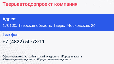 Тверьавтодорпроект, компания по адресу 170100, Тверская область, Тверь, Московская, 26 в дальнейшем Организация, размещена в следующих категориях: