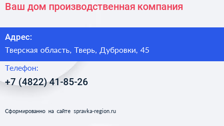 Ваш дом, производственная компания по адресу Тверская область, Тверь, Дубровки, 45 в дальнейшем Организация, размещена в следующих категориях: