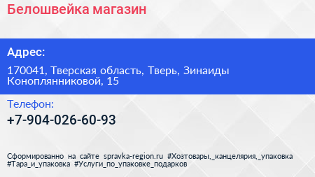 Белошвейка, магазин по адресу 170041, Тверская область, Тверь, Зинаиды Коноплянниковой, 15 в дальнейшем Организация, размещена в следующих категориях: