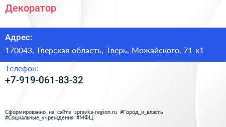 Декоратор по адресу 170043, Тверская область, Тверь, Можайского, 71 к1 в дальнейшем Организация, размещена в следующих категориях: