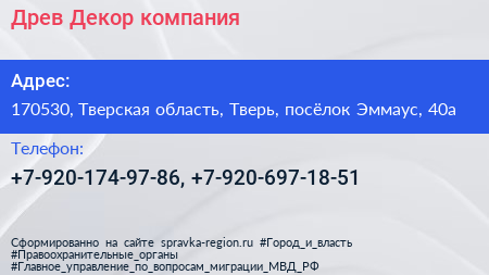 Древ-Декор, компания по адресу 170530, Тверская область, Тверь, посёлок Эммаус, 40а в дальнейшем Организация, размещена в следующих категориях: