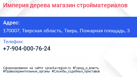 Империя дерева, магазин стройматериалов по адресу 170007, Тверская область, Тверь, Пожарная площадь, 3 в дальнейшем Организация, размещена в следующих категориях:
