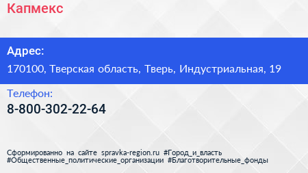 Капмекс по адресу 170100, Тверская область, Тверь, Индустриальная, 19 в дальнейшем Организация, размещена в следующих категориях: