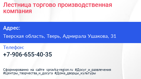 Лестница, торгово-производственная компания по адресу Тверская область, Тверь, Адмирала Ушакова, 31 в дальнейшем Организация, размещена в следующих категориях:
