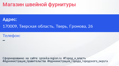 Магазин швейной фурнитуры по адресу 170009, Тверская область, Тверь, Громова, 26 в дальнейшем Организация, размещена в следующих категориях: