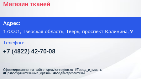Магазин тканей по адресу 170001, Тверская область, Тверь, проспект Калинина, 9 в дальнейшем Организация, размещена в следующих категориях:
