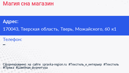 Магия сна, магазин по адресу 170043, Тверская область, Тверь, Можайского, 60 к1 в дальнейшем Организация, размещена в следующих категориях: