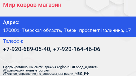 Мир ковров, магазин по адресу 170001, Тверская область, Тверь, проспект Калинина, 17 в дальнейшем Организация, размещена в следующих категориях: