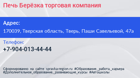 Печь Берёзка, торговая компания по адресу 170039, Тверская область, Тверь, Паши Савельевой, 47а в дальнейшем Организация, размещена в следующих категориях: