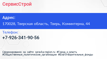СервисСтрой по адресу 170028, Тверская область, Тверь, Коминтерна, 44 в дальнейшем Организация, размещена в следующих категориях: