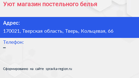 Уют, магазин постельного белья по адресу 170021, Тверская область, Тверь, Кольцевая, 66 в дальнейшем Организация, размещена в следующих категориях: