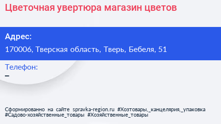 Цветочная увертюра, магазин цветов по адресу 170006, Тверская область, Тверь, Бебеля, 51 в дальнейшем Организация, размещена в следующих категориях: