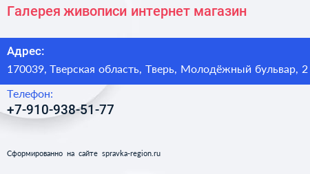 Галерея живописи, интернет-магазин по адресу 170039, Тверская область, Тверь, Молодёжный бульвар, 2 в дальнейшем Организация, размещена в следующих категориях:
