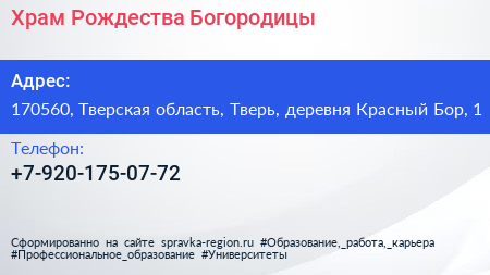 Храм Рождества Богородицы по адресу 170560, Тверская область, Тверь, деревня Красный Бор, 1 в дальнейшем Организация, размещена в следующих категориях: