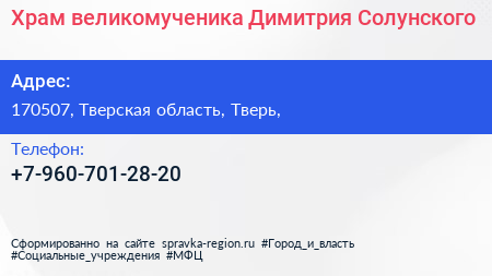 Храм великомученика Димитрия Солунского по адресу 170507, Тверская область, Тверь, в дальнейшем Организация, размещена в следующих категориях: