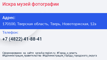 Искра, музей фотографии по адресу 170100, Тверская область, Тверь, Новоторжская, 12а в дальнейшем Организация, размещена в следующих категориях: