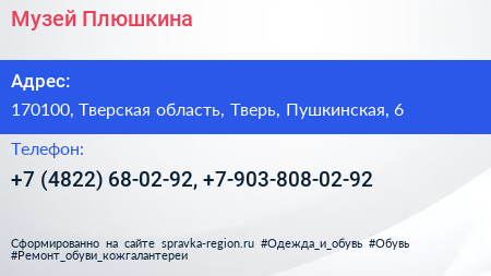 Музей Плюшкина по адресу 170100, Тверская область, Тверь, Пушкинская, 6 в дальнейшем Организация, размещена в следующих категориях: