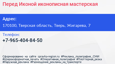 Перед Иконой, иконописная мастерская по адресу 170100, Тверская область, Тверь, Жигарева, 7 в дальнейшем Организация, размещена в следующих категориях: