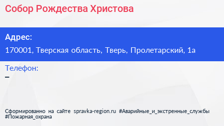 Собор Рождества Христова по адресу 170001, Тверская область, Тверь, Пролетарский, 1а в дальнейшем Организация, размещена в следующих категориях: