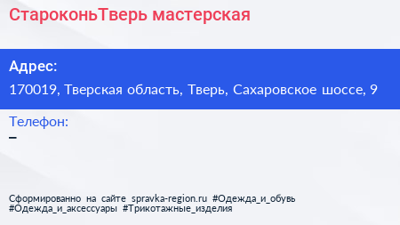 СтароконьТверь, мастерская по адресу 170019, Тверская область, Тверь, Сахаровское шоссе, 9 в дальнейшем Организация, размещена в следующих категориях: