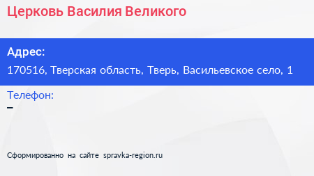 Церковь Василия Великого по адресу 170516, Тверская область, Тверь, Васильевское село, 1 в дальнейшем Организация, размещена в следующих категориях:
