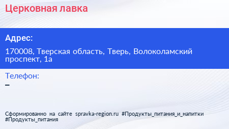 Церковная лавка по адресу 170008, Тверская область, Тверь, Волоколамский проспект, 1а в дальнейшем Организация, размещена в следующих категориях: