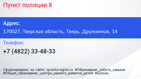 Пункт полиции №8 по адресу 170027, Тверская область, Тверь, Дружинная, 14 в дальнейшем Организация, размещена в следующих категориях: