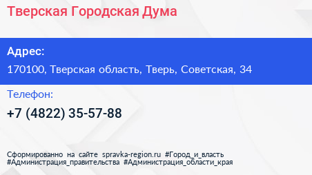 Тверская Городская Дума по адресу 170100, Тверская область, Тверь, Советская, 34 в дальнейшем Организация, размещена в следующих категориях: