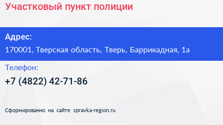 Участковый пункт полиции по адресу 170001, Тверская область, Тверь, Баррикадная, 1а в дальнейшем Организация, размещена в следующих категориях: