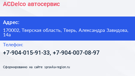 ACDelco, автосервис по адресу 170002, Тверская область, Тверь, Александра Завидова, 14а в дальнейшем Организация, размещена в следующих категориях:
