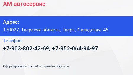АМ, автосервис по адресу 170027, Тверская область, Тверь, Складская, 45 в дальнейшем Организация, размещена в следующих категориях: