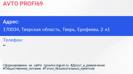 AVTO-PROFI69 по адресу 170034, Тверская область, Тверь, Ерофеева, 2 к1 в дальнейшем Организация, размещена в следующих категориях: