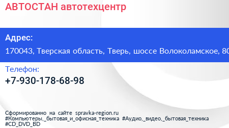 АВТОСТАН, автотехцентр по адресу 170043, Тверская область, Тверь, шоссе Волоколамское, 80 в дальнейшем Организация, размещена в следующих категориях: