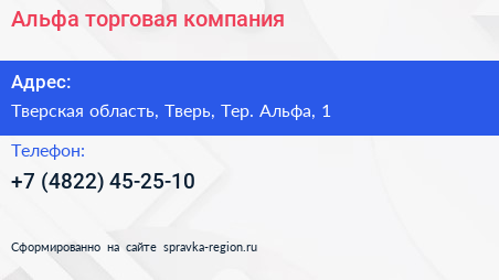 Альфа, торговая компания по адресу Тверская область, Тверь, Тер. Альфа, 1 в дальнейшем Организация, размещена в следующих категориях: