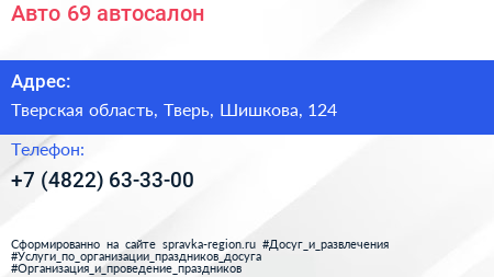 Авто 69, автосалон по адресу Тверская область, Тверь, Шишкова, 124 в дальнейшем Организация, размещена в следующих категориях: