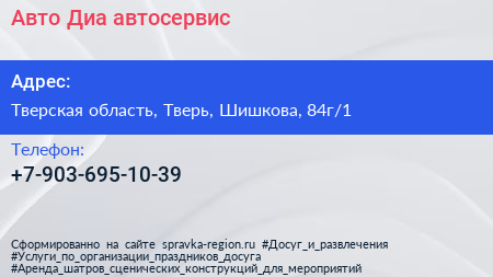 Авто-Диа, автосервис по адресу Тверская область, Тверь, Шишкова, 84г/1 в дальнейшем Организация, размещена в следующих категориях: