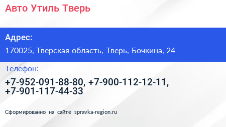 Авто Утиль Тверь по адресу 170025, Тверская область, Тверь, Бочкина, 24 в дальнейшем Организация, размещена в следующих категориях: