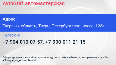 AvtoGraf, автомастерская по адресу Тверская область, Тверь, Петербургское шоссе, 126а в дальнейшем Организация, размещена в следующих категориях: