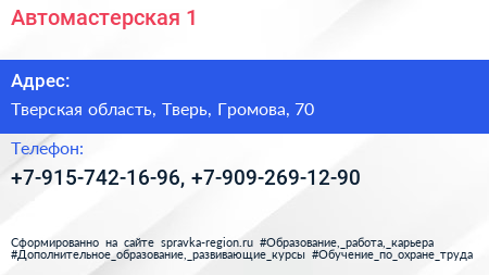 Автомастерская №1 по адресу Тверская область, Тверь, Громова, 70 в дальнейшем Организация, размещена в следующих категориях: